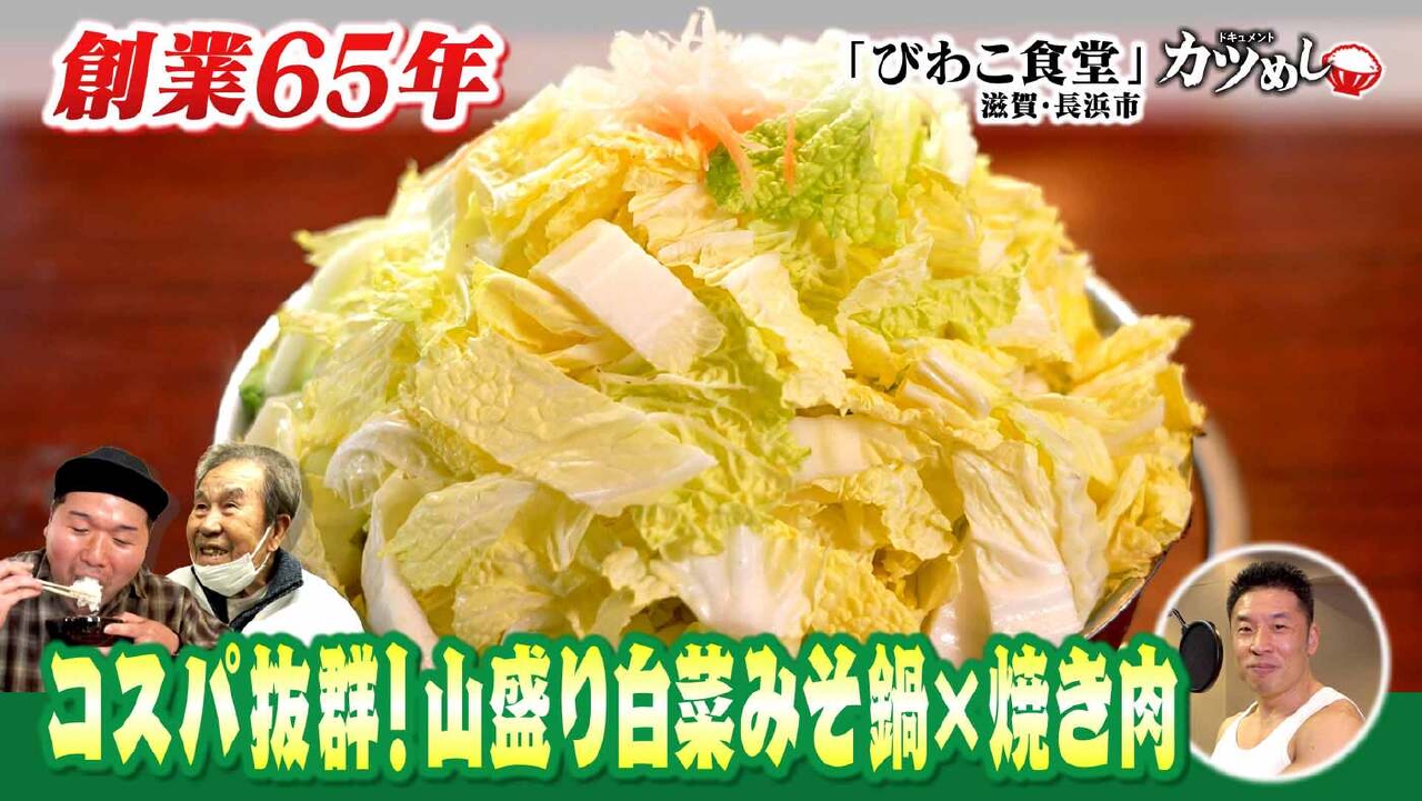 滋賀県長浜市高月町の『びわこ食堂』は今年創業65周年の鍋と焼き肉の店。初代の田㞍善信さん(90)が創業し7年前に長男の善仁さん(60)が引き継いで、姉や弟と一緒に家族で営業している。焼き肉は和牛を使いながらも全メニュー1000円以下。さらに店の人気メニューは初代の善信さんが苦労の末に考案した、白味噌をベースに22種類の調味料を加えたオリジナルの“とりやさいみそ”で作るみそ鍋。鍋のメニューは肉の違いで5種類あるが、定番は“とりやさい鍋”で1人前750円。具材は鍋からあふれそうなくらい山盛りの白菜と鶏肉だけだが、味噌の味を最大限に生かしたスープの味が評判で「白菜鍋の概念がくつがえった」と客が話すほどの人気ぶり!『滋賀県民のソウルフード』と言われ、さらに休日には県外からもお客が詰めかけ行列ができる店のコスパ抜群の山盛りメニューに密着。 ナレーション:なかやまきんに君 (2025年2月20日放送 MBSテレビ「よんチャンTV」内『カツめし』より)