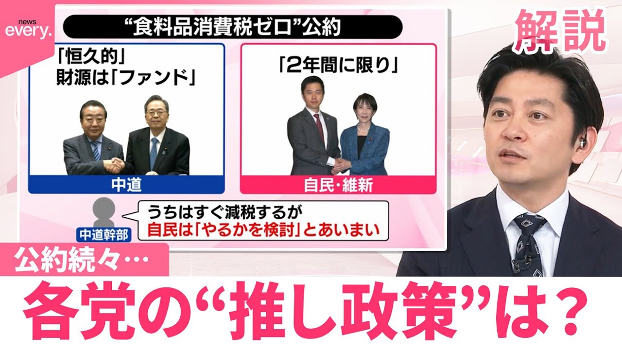 22日は主要な野党が続々と政策の発表などを行っていますが、この選挙公約についてお伝えします。今回の#みんなのギモンでは、「公約続々…各党の“推し政策”は?」をテーマに解説します。 (2026年1月22日放送「news every.」より)