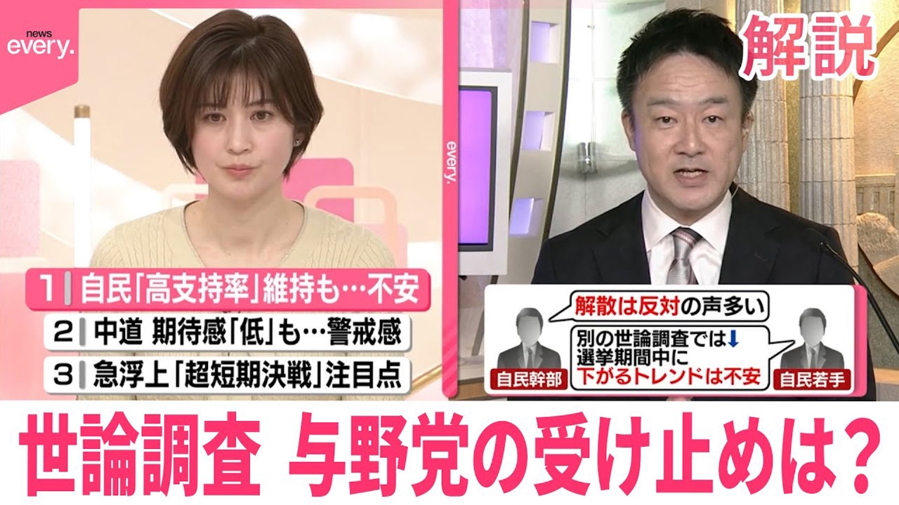 NNNと読売新聞が今月23日から25日まで行った世論調査で、高市内閣の支持率は、先月の調査から4ポイント下げ、69%でした。世論調査の結果を各党はどう受け止めているのか、日本テレビ・政治部官邸キャップの平本典昭記者に次の3つのギモンで聞いていきます。 (2026年1月26日放送「news every.」より)