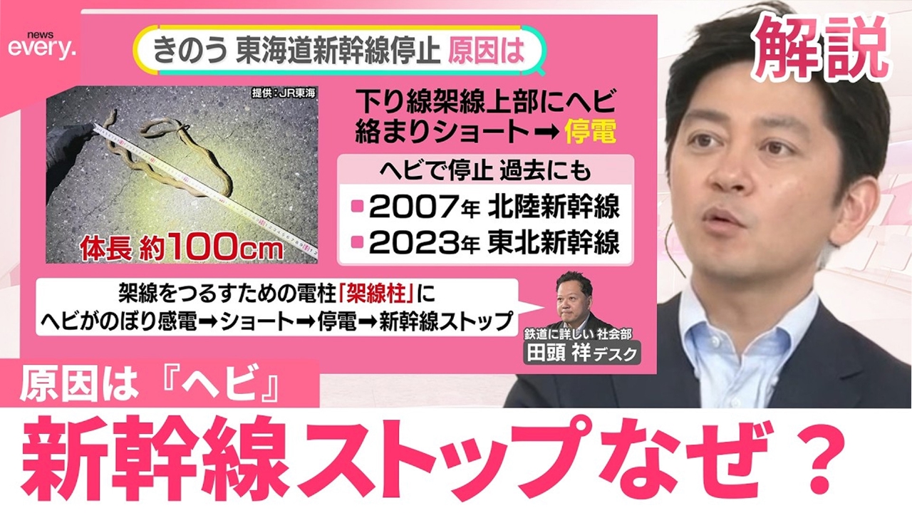 ゴールデンウイーク中の4月30日、東海道新幹線は午後5時半ごろに発生した停電の影響で約1時間半にわたって運行がストップ。約6万7000人に影響が出ました。この停電、原因は「ヘビ」でした。このヘビは長さ約100センチで、岐阜県大垣市内の線路で見つかったということです。そこで今回の#みんなのギモンでは、「新幹線ストップ 原因は『ヘビ』なぜ?」をテーマに解説します。 (2025年5月1日放送「news every.」より)