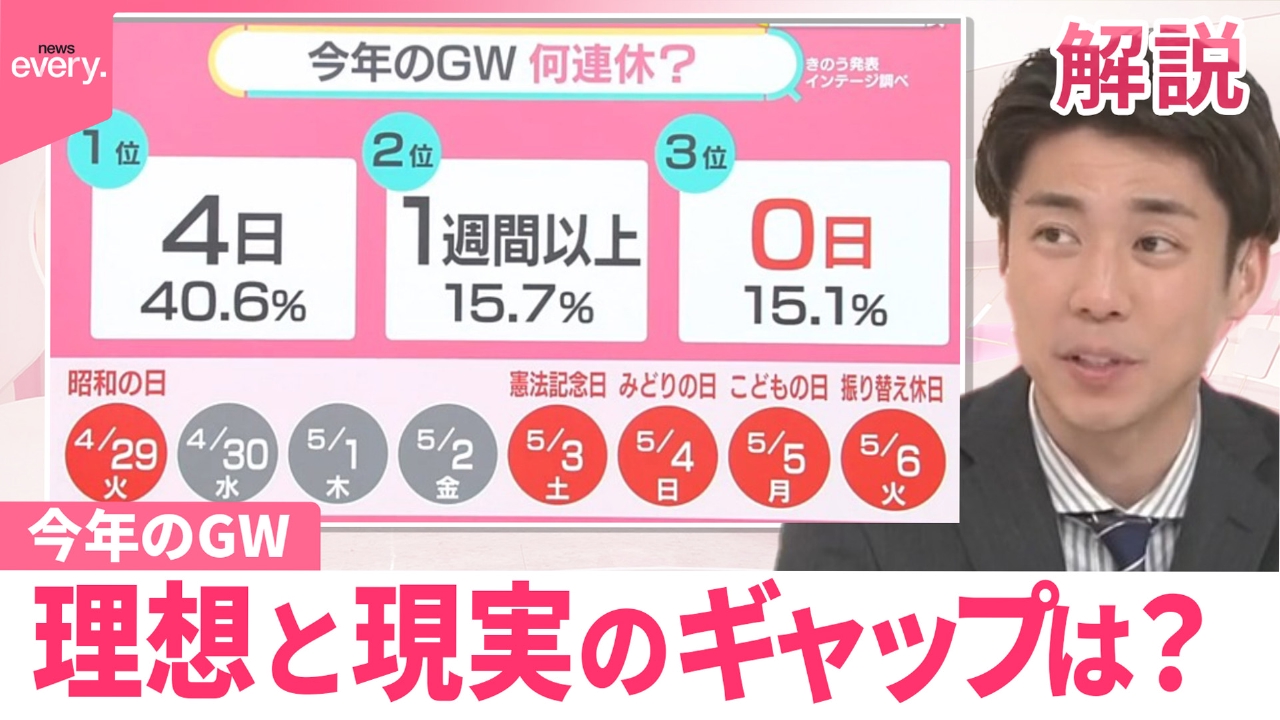 ゴールデンウイークの過ごし方について「本当は旅行や遊びに行きたいけど、行けない」という、ゴールデンウイークをめぐる葛藤がみえてきました。そこで今回の#みんなのギモンでは、「ゴールデンウイーク 理想と現実のギャップは?」をテーマに解説します。 (2025年4月18日放送「news every.」より)