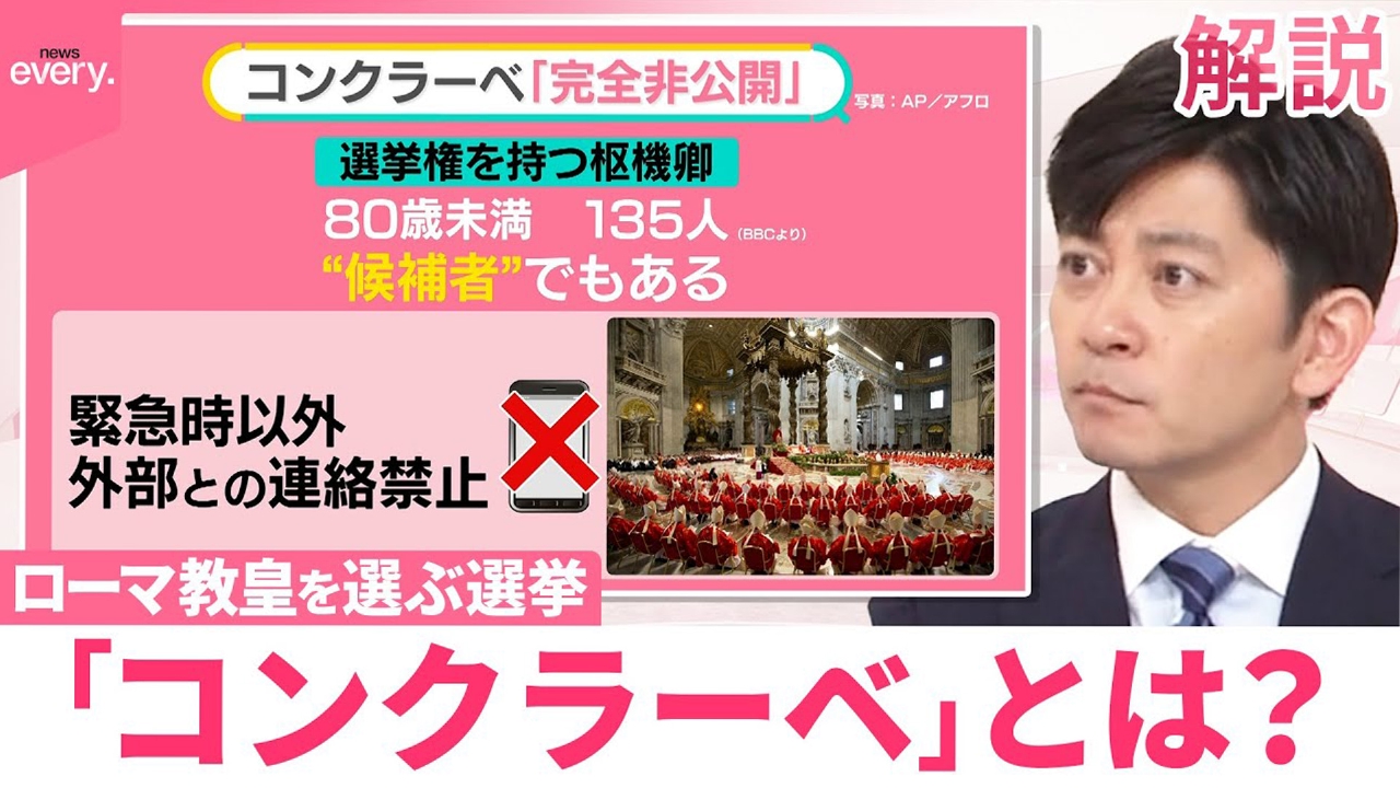 ローマ・カトリック教会のフランシスコ教皇が21日、亡くなりました。教皇は今年2月から肺炎で1か月以上入院し、先月、退院したばかりでした。ローマ教皇庁によると死因は脳卒中とそれに伴う心不全だということです。 今後、14億人のカトリック信者のトップである次の教皇を選ぶ選挙「コンクラーベ」が行われます。そこで今回の#みんなのギモンでは、「ローマ教皇選ぶコンクラーベとは?」をテーマに解説します。 (2025年4月22日放送「news every.」より)