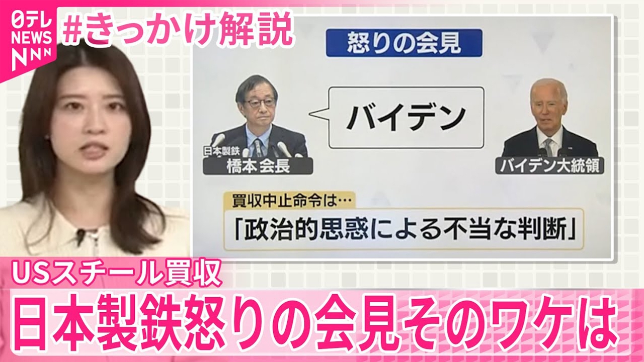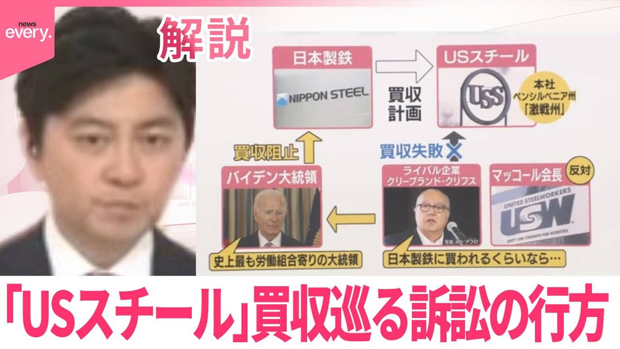 「日本製鉄」がアメリカの鉄鋼大手「USスチール」を買収する計画についてバイデン大統領が、阻止する命令を出し、日本製鉄が無効を求める訴訟を起こしました。経済部・片山桂子記者と国際部・山崎大輔ワシントン支局長に話を聞きました。 (2025年1月7日放送「news every.」より)