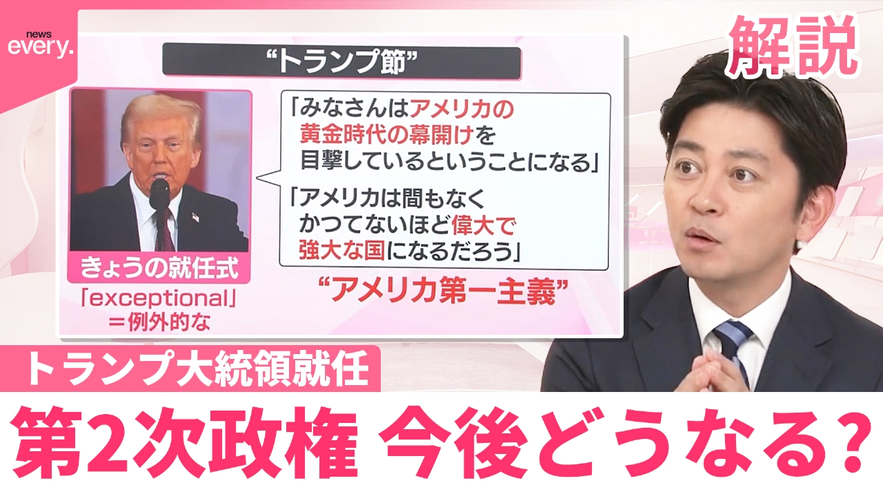 アメリカの第47代大統領にドナルド・トランプ氏が就任しました。トランプ大統領の第2次政権が今後どうなっていくのか、日本テレビ国際部の小林史部長とともに詳しく解説します。 (2025年1月21日放送「news every.」より)
