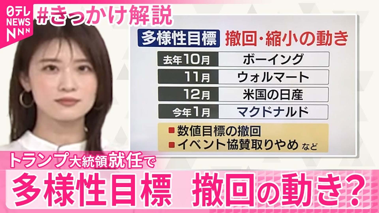 ニュースのその先を考える記者解説です。23日のテーマは「トランプ大統領就任で、多様性目標、相次ぎ撤回?」経済部の安藤解説委員の解説です。 (1月23日放送『news every.』より)