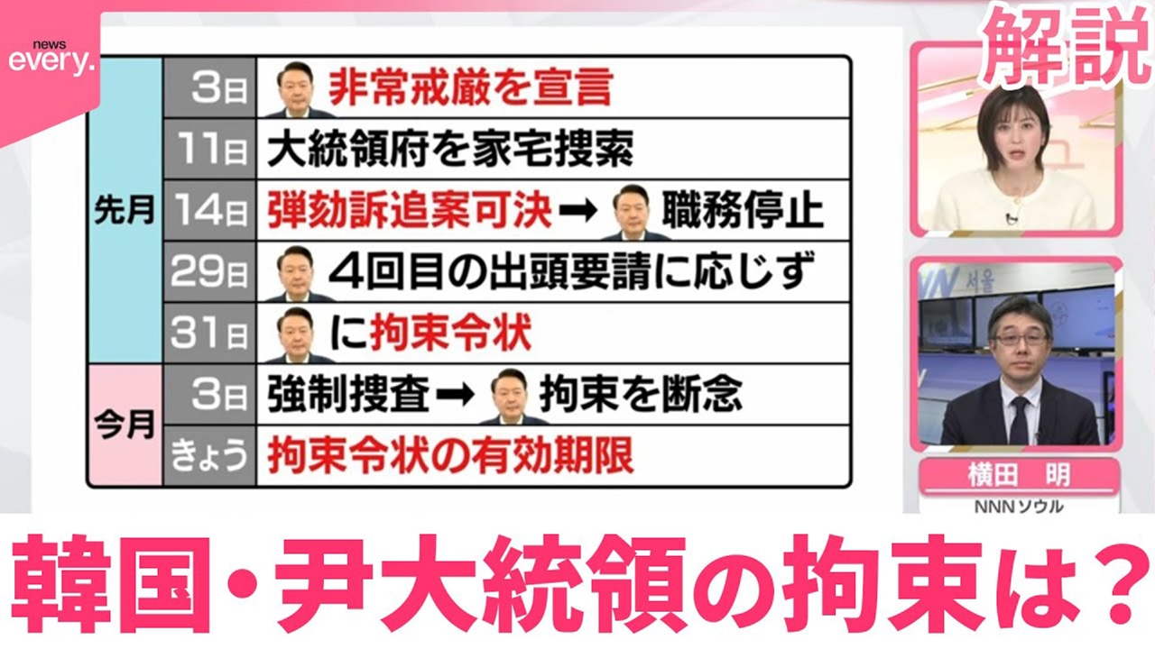 韓国の尹錫悦大統領の非常戒厳を巡り6日、捜査機関が請求していた拘束令状の執行期限を迎えます。この先の見通しについて、ソウル支局長の横田明記者に聞きます。 (2025年1月6日放送「news every.」より)