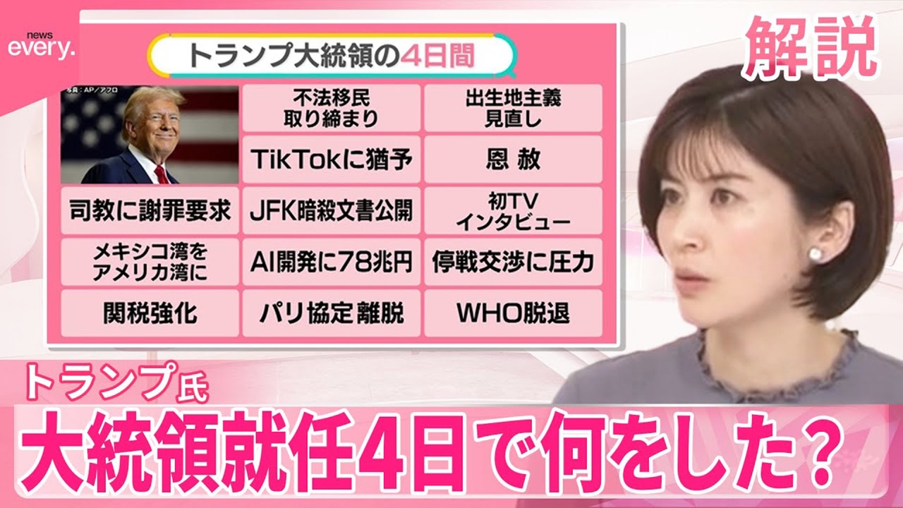 20日にアメリカの大統領に就任したトランプ氏は、スタートダッシュに賭けている様子です。多くの大統領令を出し、社会を揺さぶる言動を見せています。最初から詰め込んでいるのには、ある事情がありました。やりたい放題の4年間になるのでしょうか。(2025年1月24日放送 『news every.』より)