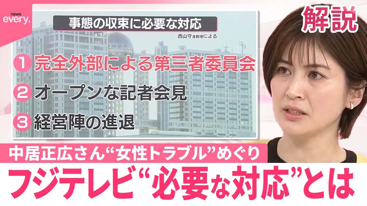 中居正広さんの女性トラブルを巡り、フジテレビの一連の対応やマネジメントについて、どういう問題があったのか。そして、今後どうしていくべきなのか。フジテレビが事態を収束するために必要な対応について、桜美林大学の西山守准教授が解説します。 (1月23日放送『news every.』より)