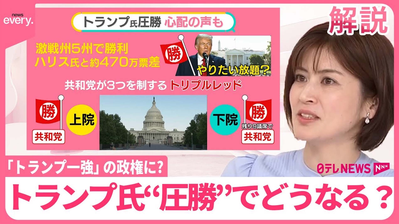 アメリカ大統領選挙に勝利し、大統領に返り咲くことになったトランプ氏。「トランプ一強」の政権になりそうな中、やりたい放題になるのではないかという懸念の声も上がっています。そこで今回の#みんなのギモンでは、「トランプ氏“圧勝”でどうなる?」をテーマに、次のポイントを中心に解説します。 (2024年11月7日放送「news every.」より)