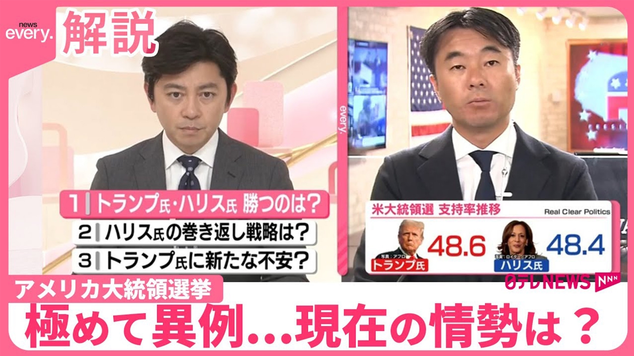 アメリカ大統領選挙まであと1週間です。トランプ氏とハリス氏が争う現在の大統領選の情勢について、日本テレビの山崎大輔ワシントン支局長が解説します。 (2024年10月29日放送「news every. 」より)