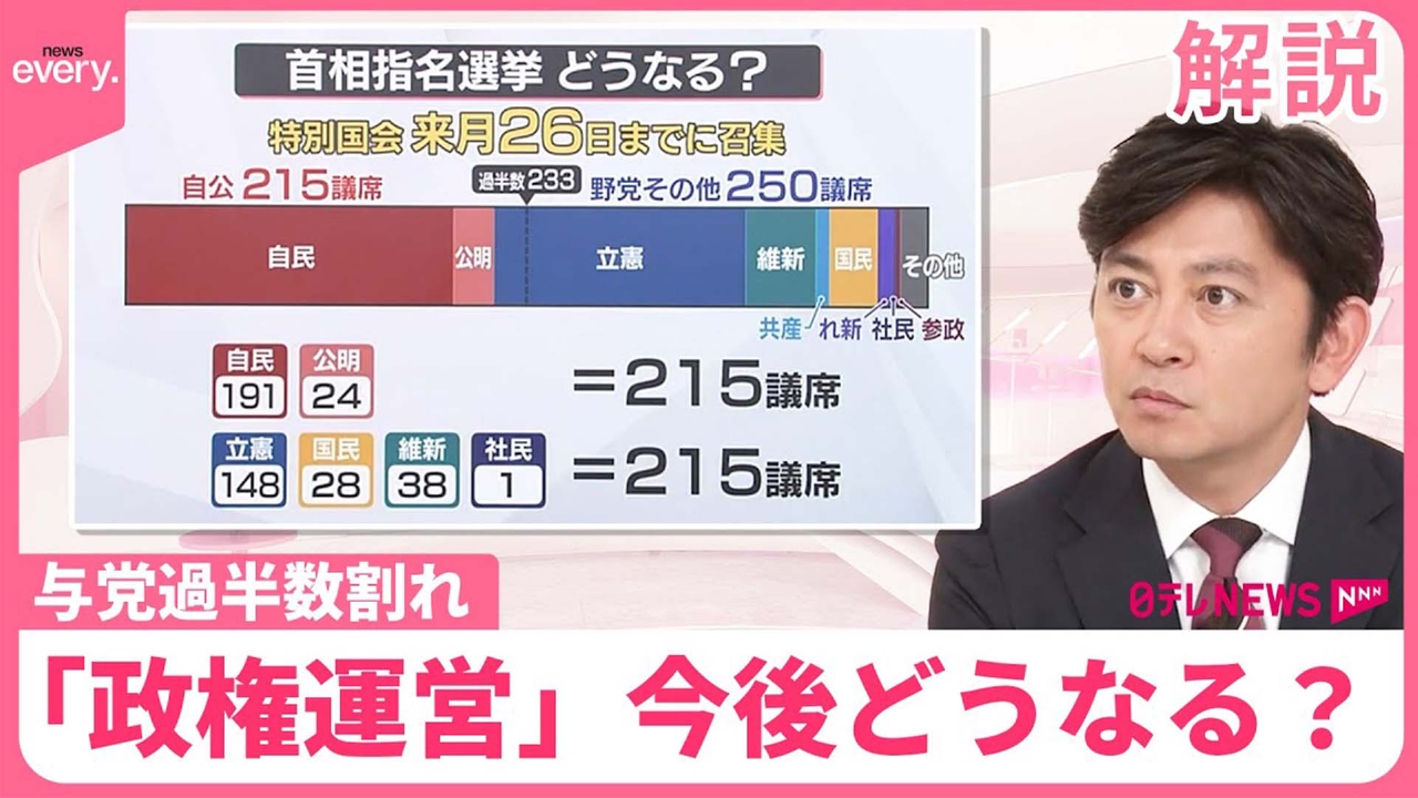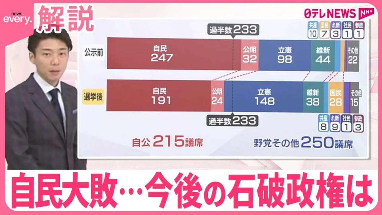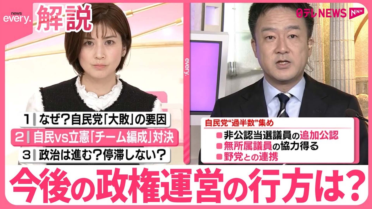 衆議院選挙の結果、自民・公明合わせた与党の議席は過半数を割ることになりました。今後、石破首相の政権はどうなるのでしょうか。日本テレビ政治部官邸キャップの平本典昭記者に、以下の3つの疑問について聞きました。 1.なぜ?自民党「大敗」の要因 2.自民vs立憲「チーム編成」対決 3.政治は進む?停滞しない? (2024年10月28日放送「news every.」より)