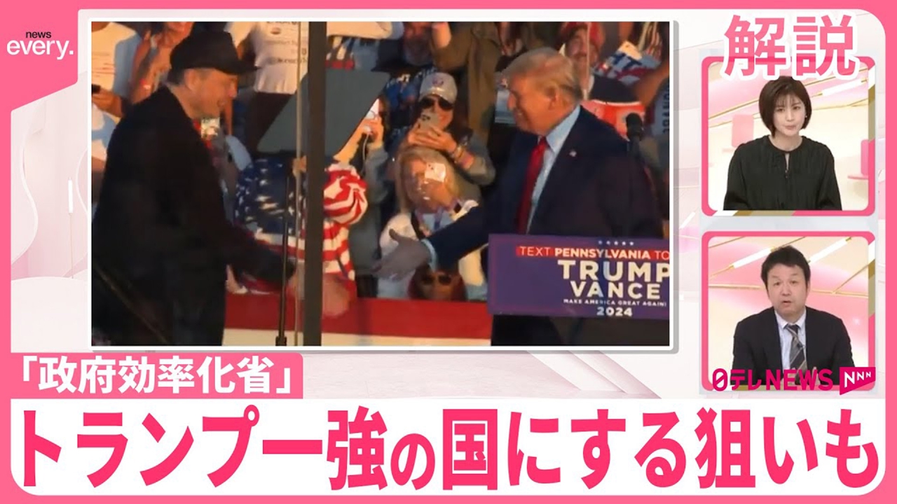 12日、トランプ次期大統領は、政府支出の効率化や規制の撤廃などを行う「政府効率化省」を新設し、イーロン・マスク氏と、大統領選挙で共和党の候補者指名を争った実業家のラマスワミ氏が共同で率いると発表しました。政府の外から助言を行うとしています。トランプ氏は声明で、遅くとも2026年7月の独立記念日までに「政府支出の膨大な無駄遣いを一掃する」と強調しました。今後の動きについて、国際部の富田徹デスクが詳しく解説します。 (2024年11月13日放送「news every.」より)
