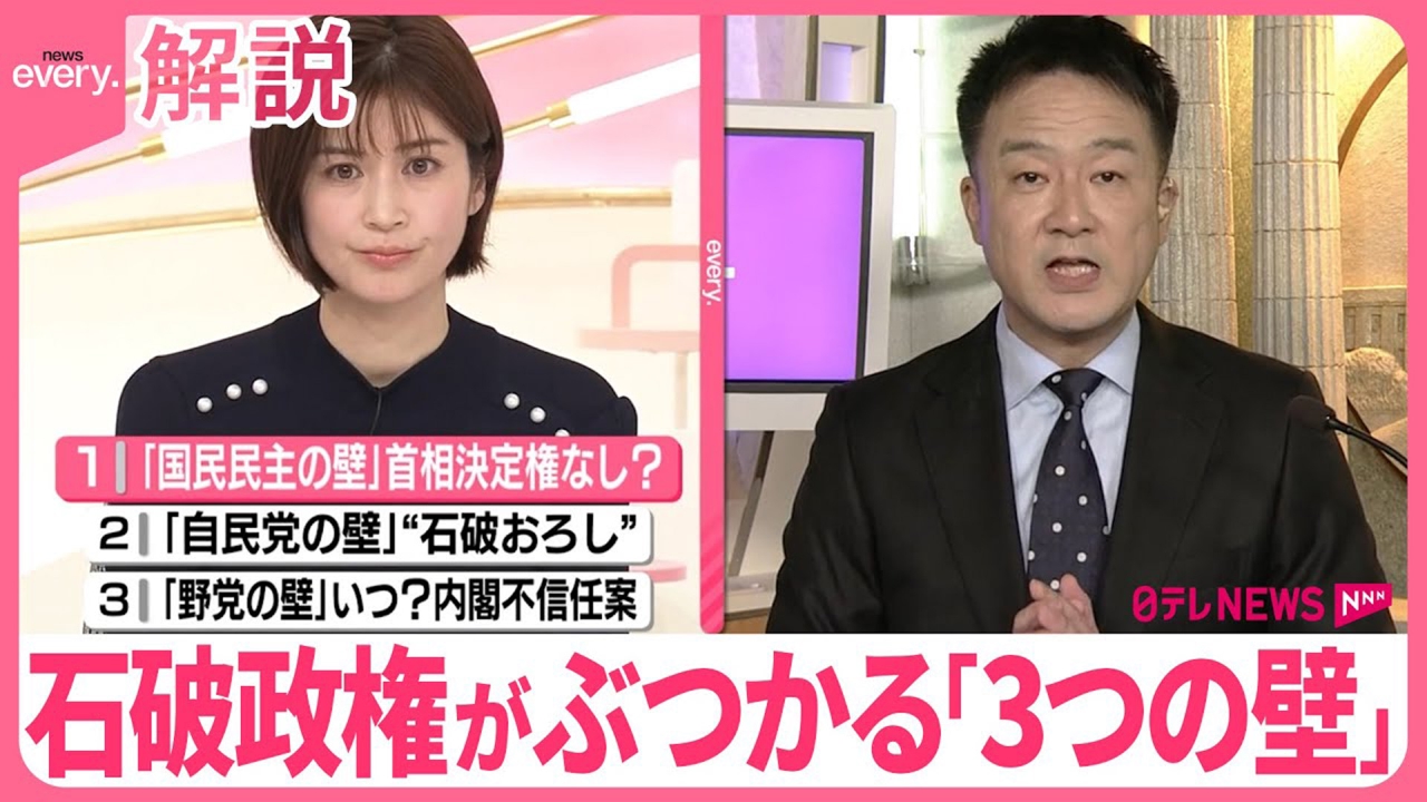 石破首相は11日午後、衆議院本会議で決選投票のすえ、改めて内閣総理大臣に選出されました。石破政権が今後ぶつかる「3つの壁」について政治部官邸キャップの平本典昭記者が解説します。 (2024年11月11日放送「news every.」より)