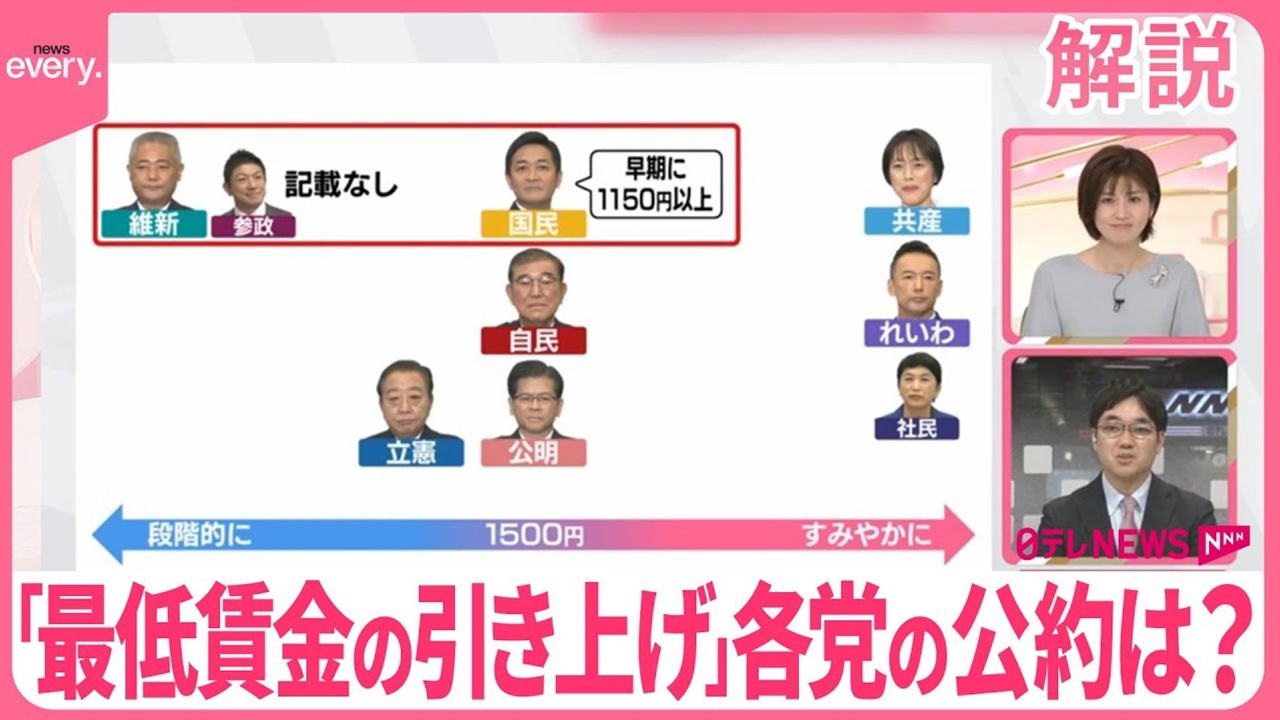 衆議院選挙の投開票まであと4日です。「news every.」では「ひと目で分かる政策比較」と題して、各政党の公約を整理してお伝えしています。23日は各党が掲げる「最低賃金の引き上げ」について、経済部の渡邊翔記者が解説します。 (2024年10月23日放送「news every.」より)