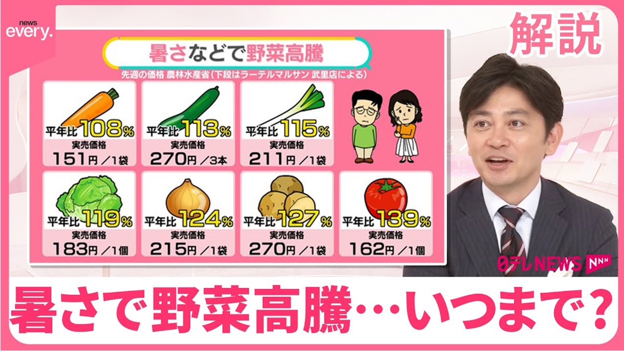 異常な暑さや大雨の影響で、野菜の値段が高い状態が続きます。困っているのは消費者だけはなく、安く売りたくても売れないスーパーも同様です。実売価格やお買い得な野菜について、農林水産省のデータや店頭で調べました。高値はいつまで続くのでしょうか? (2024年10月2日放送「news every.」より)