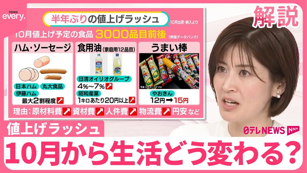 この秋、様々な値上げの波が押し寄せます。10月に値上げ予定の食品は3000品目前後で、半年ぶりの値上げラッシュに。郵便料金や薬の値段、火災保険料も改定されます。原材料費や物流費の上昇が、幅広いモノやサービスの価格上昇をもたらしています。 (2024年9月25日放送「news every.」より)