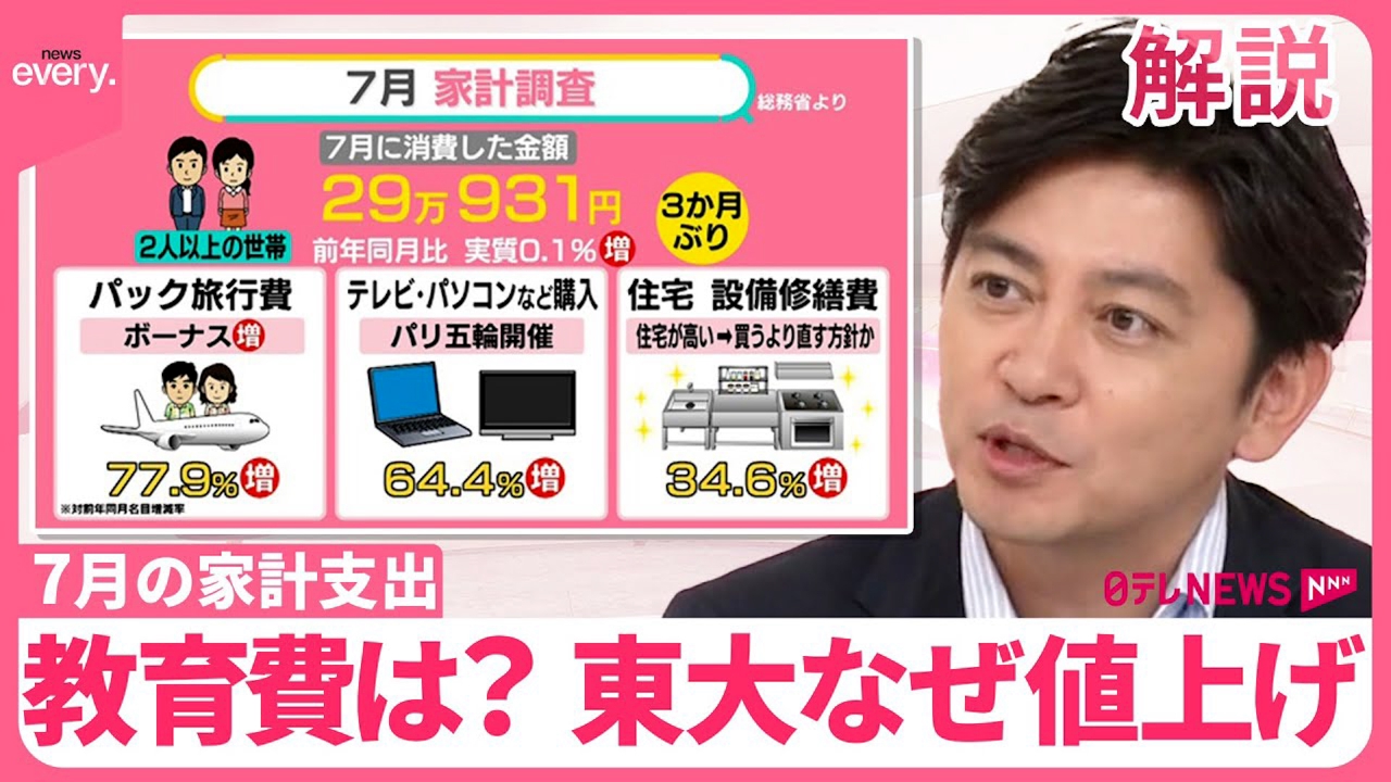 7月に家計が消費した金額は、去年同月より実質0.1%増えました。内訳を見ると、賃金上昇や物価高といった背景が見えてきます。一方、教育費をめぐって注目なのが東京大学の授業料の値上げです。学べる機会の喪失につながらないかなど、懸念もあります。 (2024年9月11日放送「news every.」より)