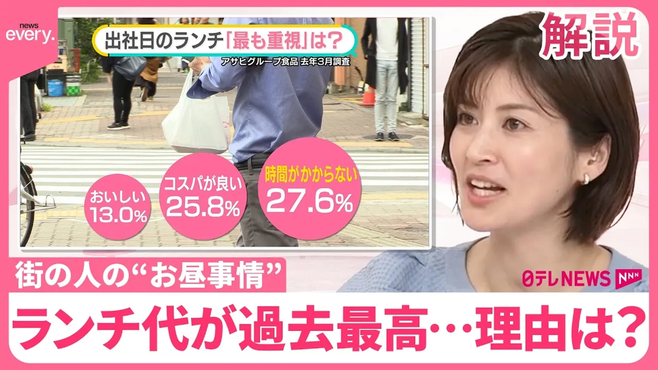 働く人たちは平日、どんなランチを食べているのか─。ある調査によると平均予算は過去最高額で、ほとんどの食べ方で前年より増額していました。街の人には、ランチ事情や節約のコツを聞きました。理想と現実に開きがある昼休憩の時間についても考えます。 (2024年9月4日放送「news every.」より)