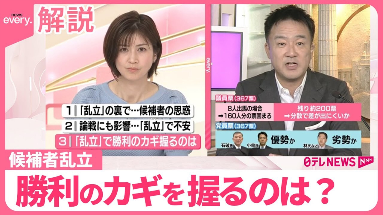 出馬表明ラッシュとなっている自民党総裁選。4日時点で史上最多、8人が出馬する見通しとなっています。候補者の乱立が選挙にどのような影響を与えるのか、日本テレビ政治部官邸キャップの平本典昭記者が、3つの疑問について解説します。 (2024年9月4日放送「news every.」より)