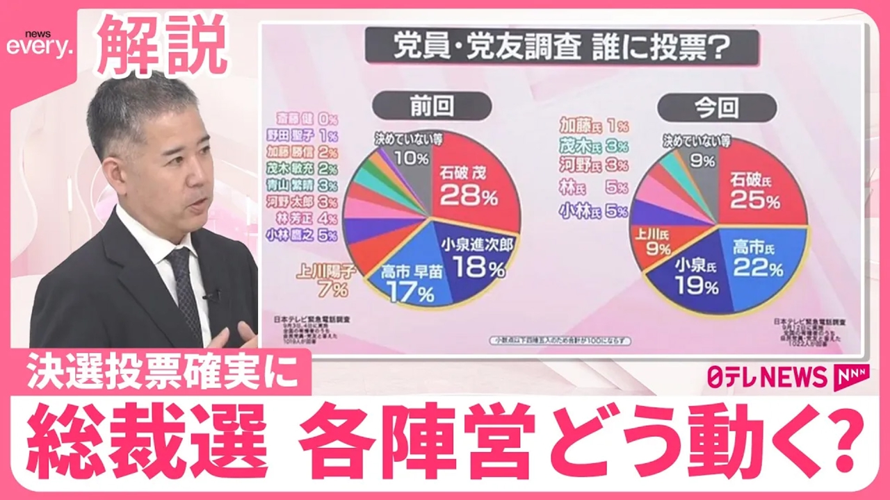 日本テレビは、自民党の党員、党友を対象に「独自に」電話調査を行い、総裁選挙で誰に投票するか、たずねたところ、石破元幹事長が25パーセントで1位、高市経済安保担当大臣が22パーセントで2位、小泉元環境大臣が19パーセントで3位でした。結果を受け、日本テレビ政治部の竹内真デスクが詳細を分析しました。 (2024年9月13日放送「news every.」より)