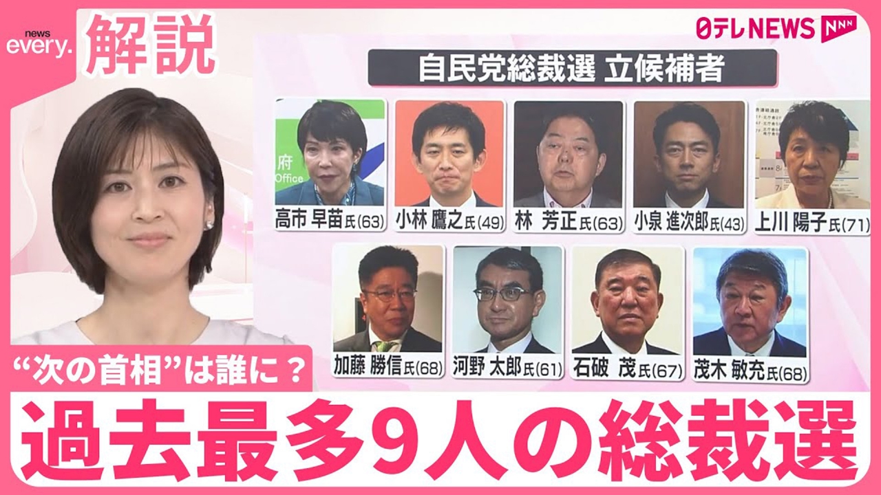 事実上、次の総理大臣を決める自民党総裁選挙が12日、告示され、過去最多となる9人が立候補を届け出ました。選挙戦の初日、候補者はどのようなビジョンを訴えたのでしょうか。総裁選の展望について、以下の3つのギモンを中心に、日本テレビ政治部官邸キャップ・平本典昭記者が解説します。 (2024年9月12日放送「news every.」より)