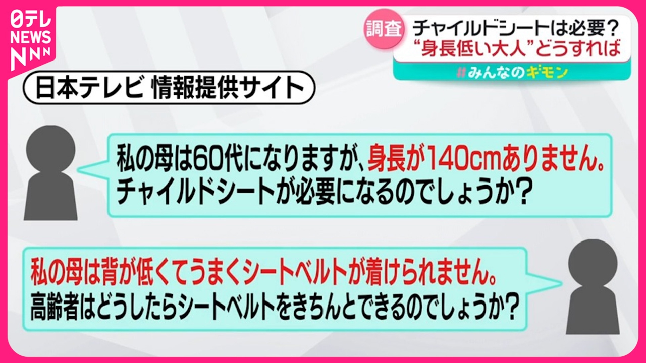 チャイルドシートを使う子どもの推奨される身長の目安が12日から10センチ引き上げられ、150センチ未満になりました。「みんなのギモン」の情報提供サイトには、「身長の低い大人もチャイルドシートが必要か」という声が複数寄せられています。どうすればいいのか、取材しました。(2024年9月12日放送「news every.」より)