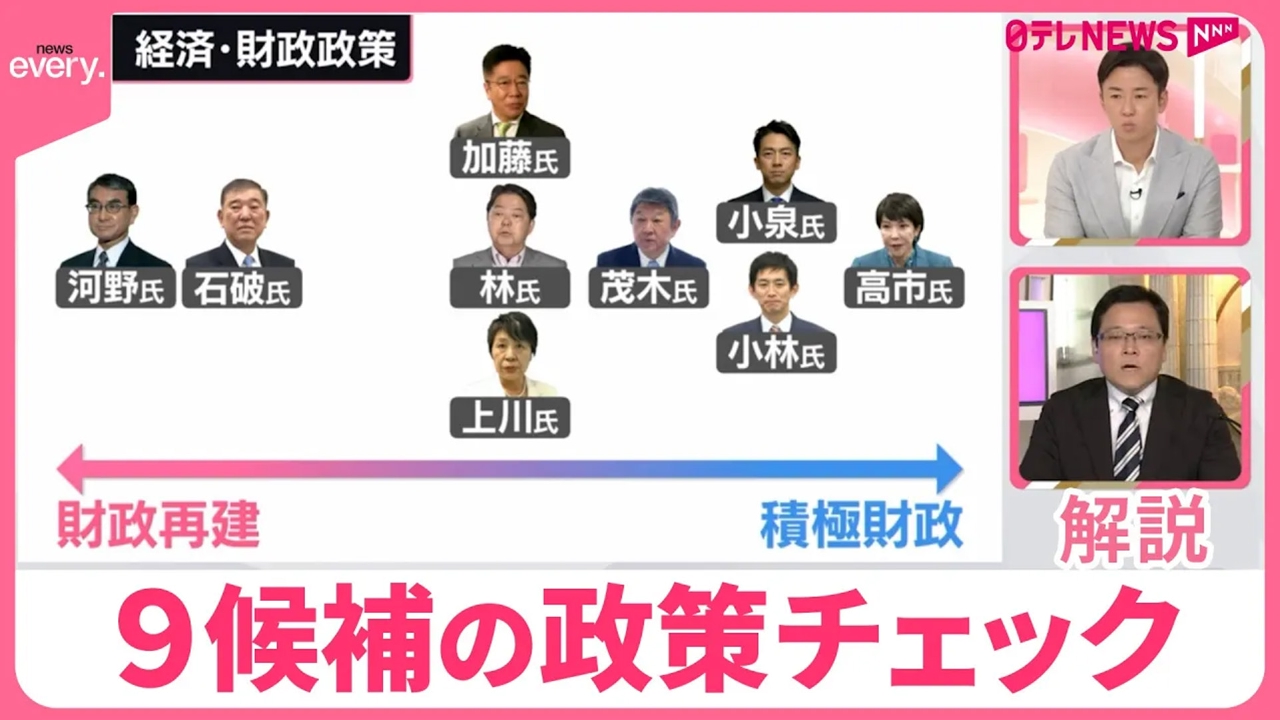 自民党の総裁選、投開票まであと10日となりました。「news every.」では、各候補の主張をテーマごとに整理してお伝えしていきます。17日は暮らしにも大きく関わる「経済・財政政策」についてです。政治部・与党キャップの前野全範記者が解説します。 (2024年9月17日放送「news every.」より)