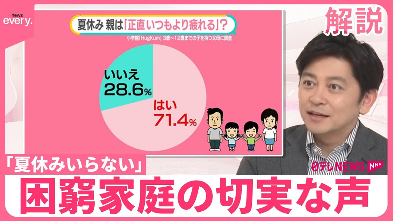 あるアンケートでは、7割超の親が「夏休みは疲れる」と回答しています。物価高が続く中、経済的に困窮する家庭にとって夏休みは生活費が重くのしかかるため、厳しさが増しています。「特別な体験をさせられない」という悩みも深く、支援が求められています。 (2024年8月6日放送「news every.」より)