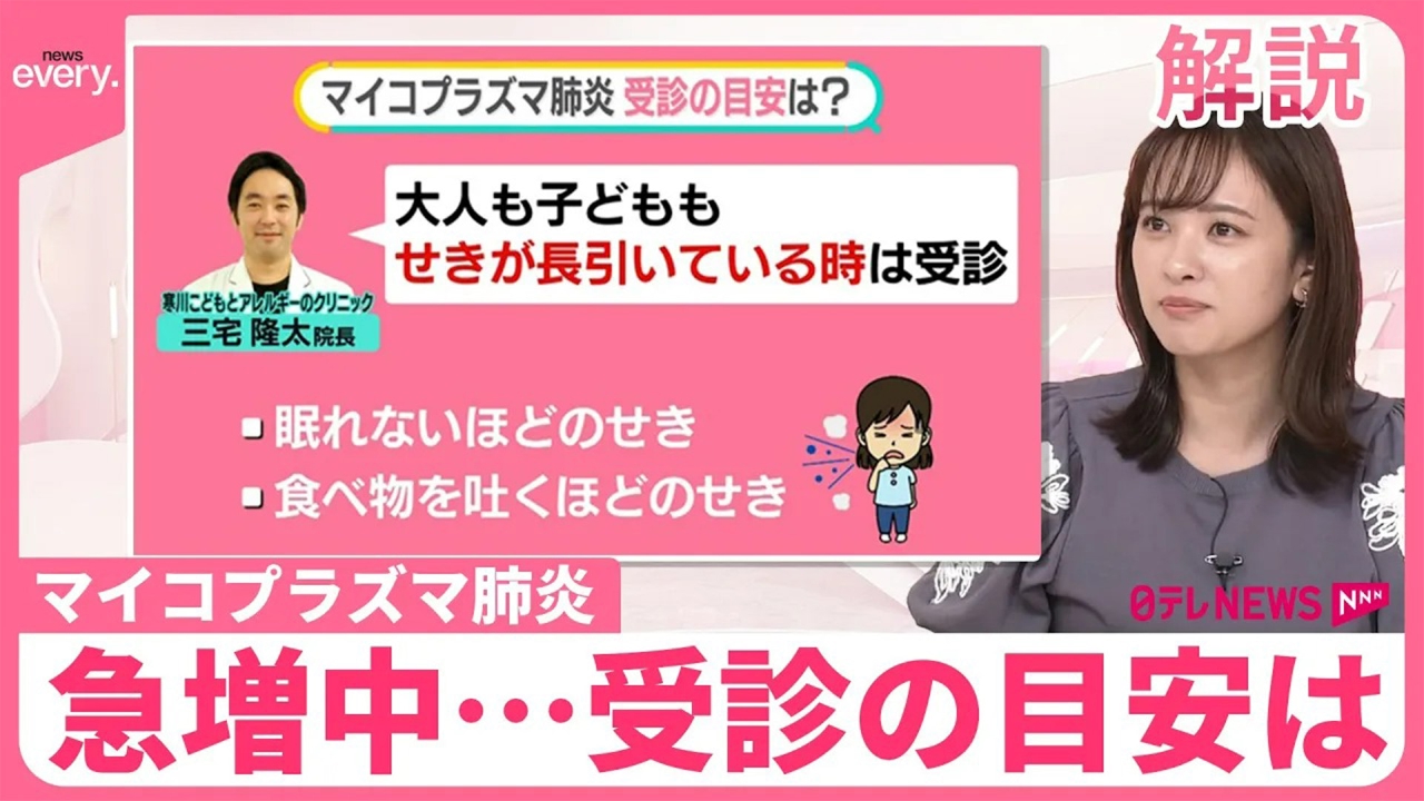 気づかずに出歩いて人にうつしやすく、“歩く肺炎”とも呼ばれる感染症「マイコプラズマ肺炎」。患者が急増し、報告数は去年の同時期の24倍に達します。せきが長引き、どんどんひどくなるケースもあります。受診の目安や対策について、医師に聞きました。 (2024年8月19日放送「news every.」より)
