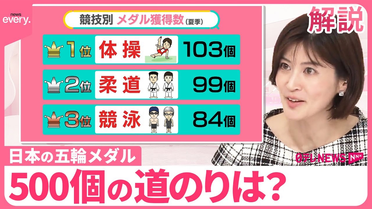 パリ五輪で、日本がメダルラッシュに沸いています。今大会のメダル第1号が柔道の角田夏実選手でしたが、そのメダルが夏のオリンピックで日本にとって“通算500個目”のメダルとなりました。「五輪メダル500個の道のりは?」をテーマに解説します。 (2024年7月29日放送「news every.」より)