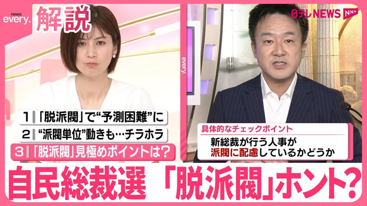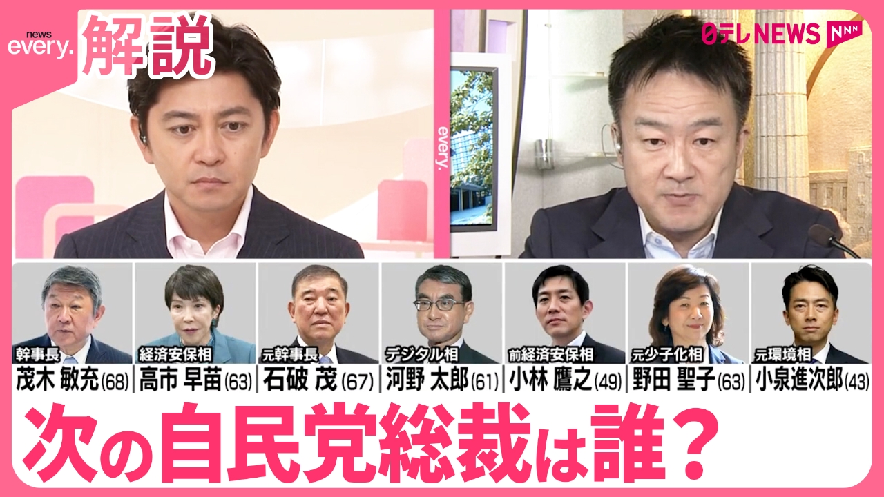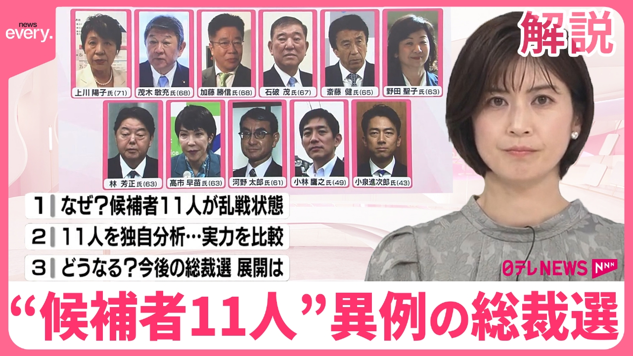 自民党総裁選挙をめぐる動きが活発化しています。19日時点で11人の名前が候補者としてあがっています。それぞれどのような強み・弱みがあるのか、日本テレビ政治部官邸キャップの平本典昭記者が解説します。 (2024年8月19日放送「news every.」より)