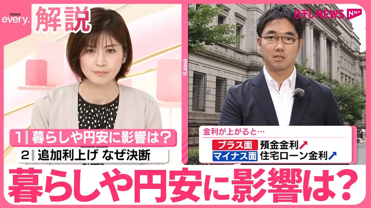 日本銀行は金融政策決定会合で、追加利上げを行い、政策金利を0.25%程度まで引き上げることを決めました。暮らしにはどんな影響が出てくるのでしょうか。経済部・日銀担当キャップの渡邊翔記者が解説します。 (2024年7月31日放送「news every.」より)
