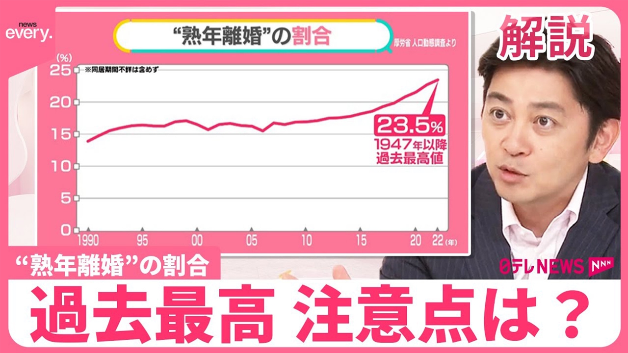20年以上連れ添った夫婦の「熟年離婚」。2022年の割合は過去最高の23.5%でした。背景には女性の社会進出や高齢化などが挙げられていますが、新型コロナウイルスの影響も指摘されています。トラブルや孤独感を避けるために注意すべき点もあります。 (2024年8月14日午後4時半ごろ放送 news every.「#みんなのギモン」より)
