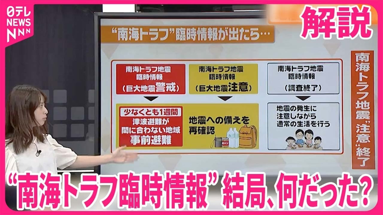 8日に初めて出された「南海トラフ地震臨時情報」。呼びかけは終了しましたが“もう安全”ではありません。改めて、この情報をどのようにとらえれば良かったのか。最近頻発する関東の地震との関連は?社会部災害担当・藤吉有咲記者が解説します【週刊地震ニュース】 (2024年8月19日放送)
