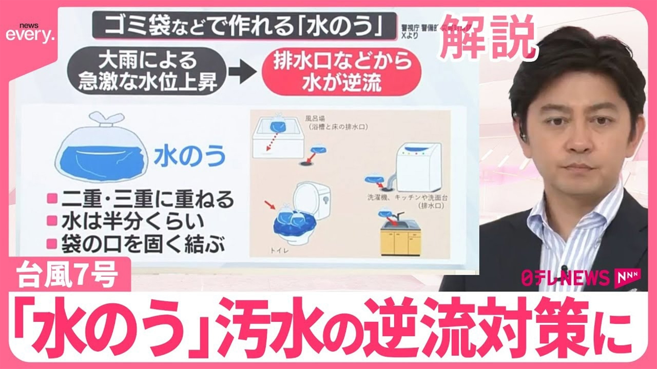 都市部ではたびたび起きることですが、大雨で急に水位が上がると、下水管が満水の状態となって下水が逆流することがあります。すると、トイレや風呂場の排水口などから水が噴き出し、家の中に下水が流れ出てしまうことに…。 (2024年8月16日放送「news every. 」より)
