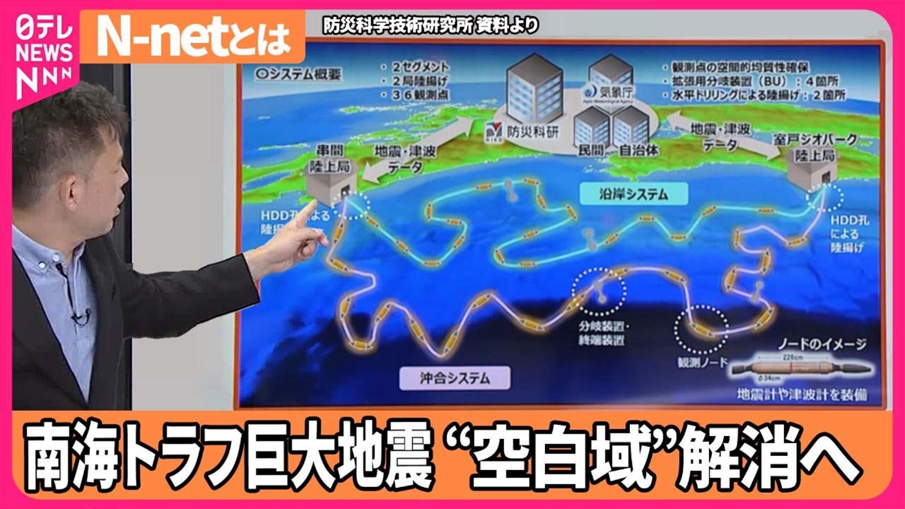 今後30年以内の発生確率が70%から80%とされる南海トラフ巨大地震。この南海トラフ巨大地震の想定震源域の海底に、地震計と水圧計がついた海底ケーブルが設置されています。この狙いは? 防災にどのように役立てられているのか? 社会部災害担当・中濱弘道デスクが解説します。【週刊地震ニュース】 (2024年6月24日放送)