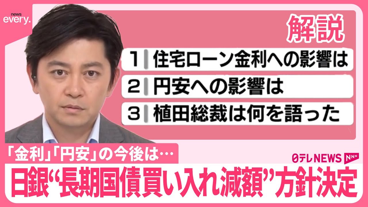 日本銀行は14日、金融政策決定会合で長期国債を買い入れる「額」を減らしていく方針を決めました。今回決まった“日銀の方針”で、今後、どのような影響があるのでしょうか。日本テレビ経済部・日銀担当キャップの渡邊翔記者が、次の3つの疑問点について、詳しく解説します。 (2024年6月14日放送「news every.」より)