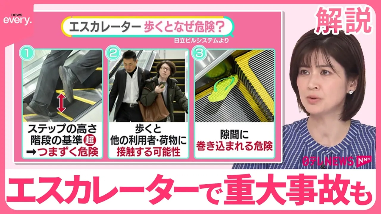 12日、都内で80代の女性がエスカレーターに挟まれて死亡しました。エスカレーターでの事故は増加傾向にあります。片側を空ける習慣は根強いものがありますが、歩くとどんな危険があるのでしょうか。メーカーなどは「歩行禁止」の動きを強化しています。 (2024年6月12日放送「news every.」より)