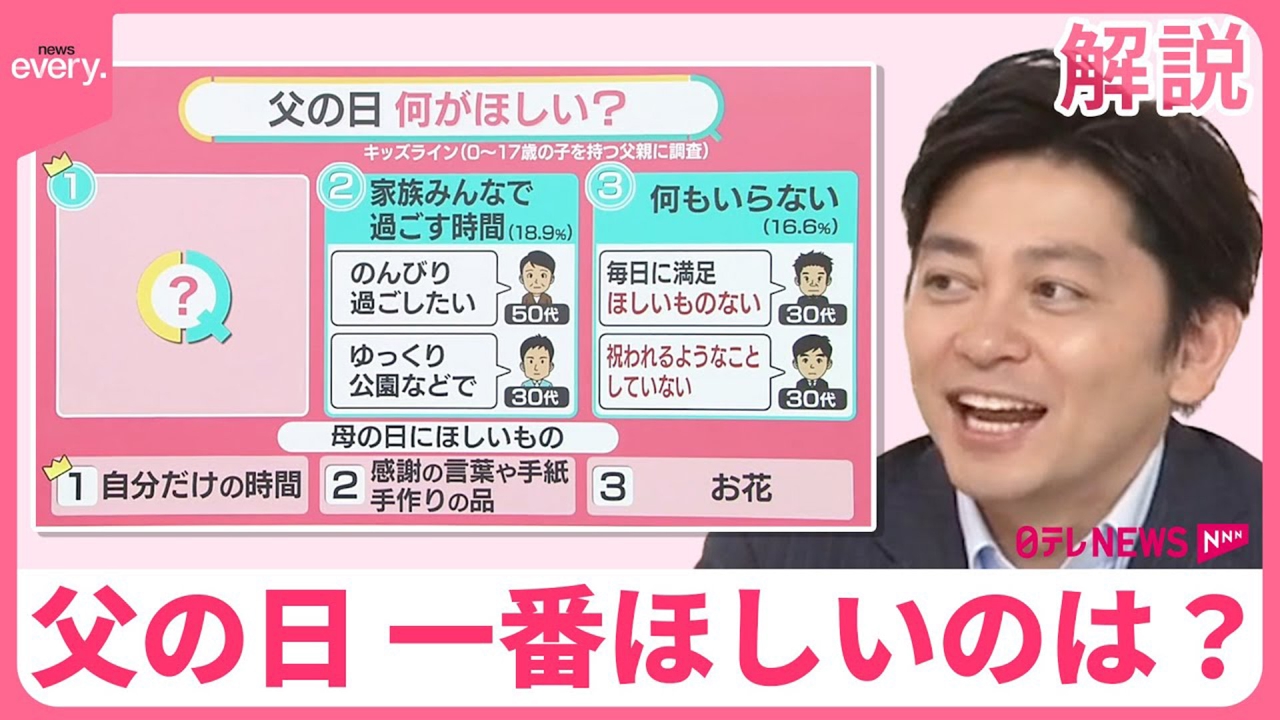 6月16日は「父の日」。母の日に比べて忘れられがちとの声もありますが、皆さん何がほしいのでしょうか? 街頭インタビューや調査から考えます。プレゼントを贈るかどうかは都道府県別の数字もあります。1位はアメリカの影響もありそうな、あの県でした。 (2024年6月10日放送「news every.」より)
