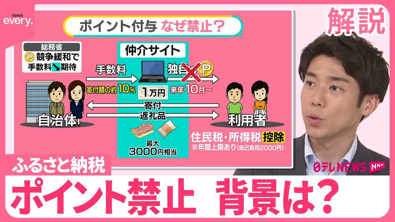 ふるさと納税の仲介サイトによるポイントの付与が、来年10月から禁止されます。背景にはポイント競争の過熱があり、総務省は自治体の手数料負担を下げられると期待。一方の仲介サイト側は「手数料にポイントの原資は含まれていない」と主張しています。 (2024年6月26日放送「news every.」より)