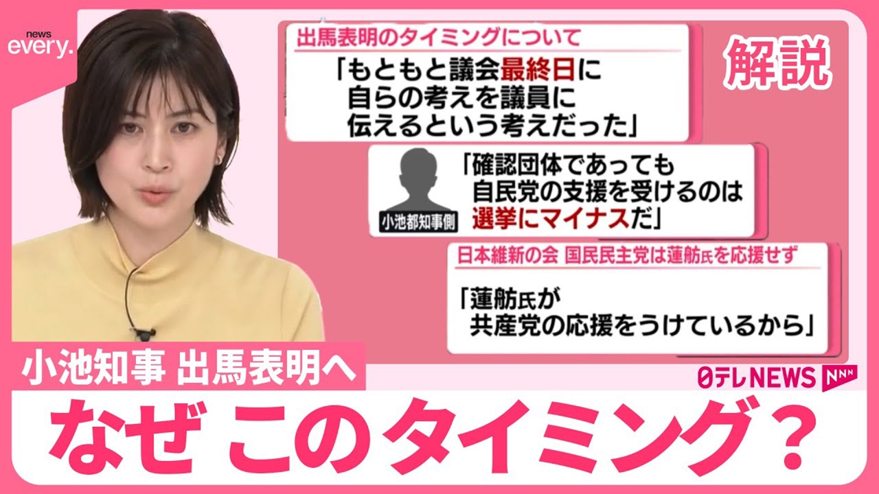 20日の告示まで1週間あまりとなった東京都知事選挙。小池都知事は12日の都議会定例会が終わった後に出馬表明をするものとみられています。7月の都知事選挙をめぐる動きについて、政治部の天野記者、社会部の内藤記者に話を聞きました。 (2024年6月11日放送「news every.」より)