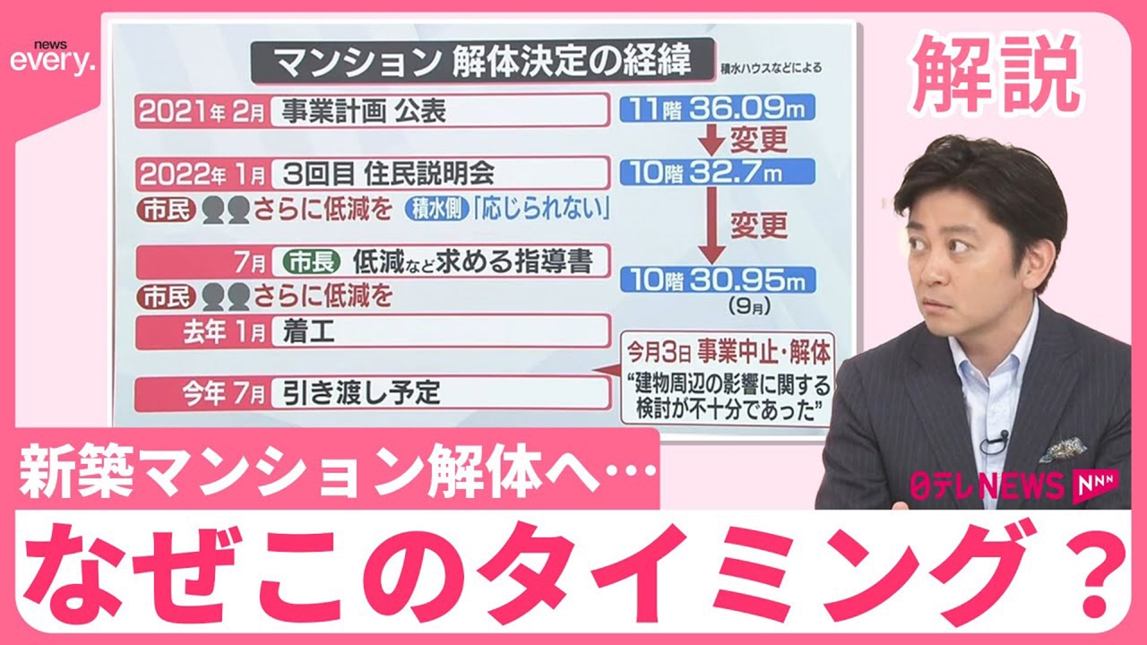 完成間近で7月には契約者に引き渡されることになっていたマンションが、突然解体されることになりました。近隣の住民からは「富士山が見えなくなる」などの声があがっていました。なぜ、解体決定がこのタイミングになったのでしょうか?不動産の売買にくわしい専門家に話を聞きました。 (2024年6月10日放送「news every.」より)