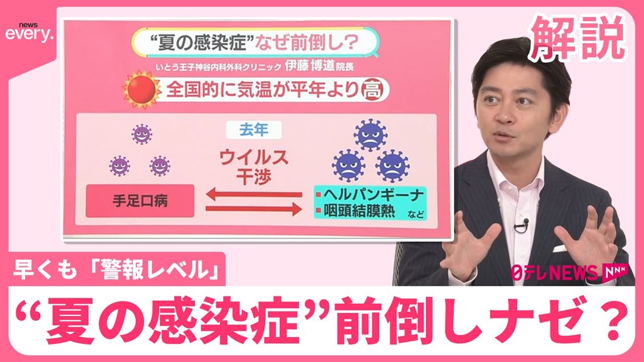 子どもを中心に夏に流行する感染症「手足口病」。各府県の患者数は警報レベルを超え、早くも流行に入っています。その背景に何があるのか、医師に聞きました。また症状が改善した後に別の感染症にかかる“感染症ドミノ”にも注意が必要だといいます。 (2024年6月7日放送「news every.」より)