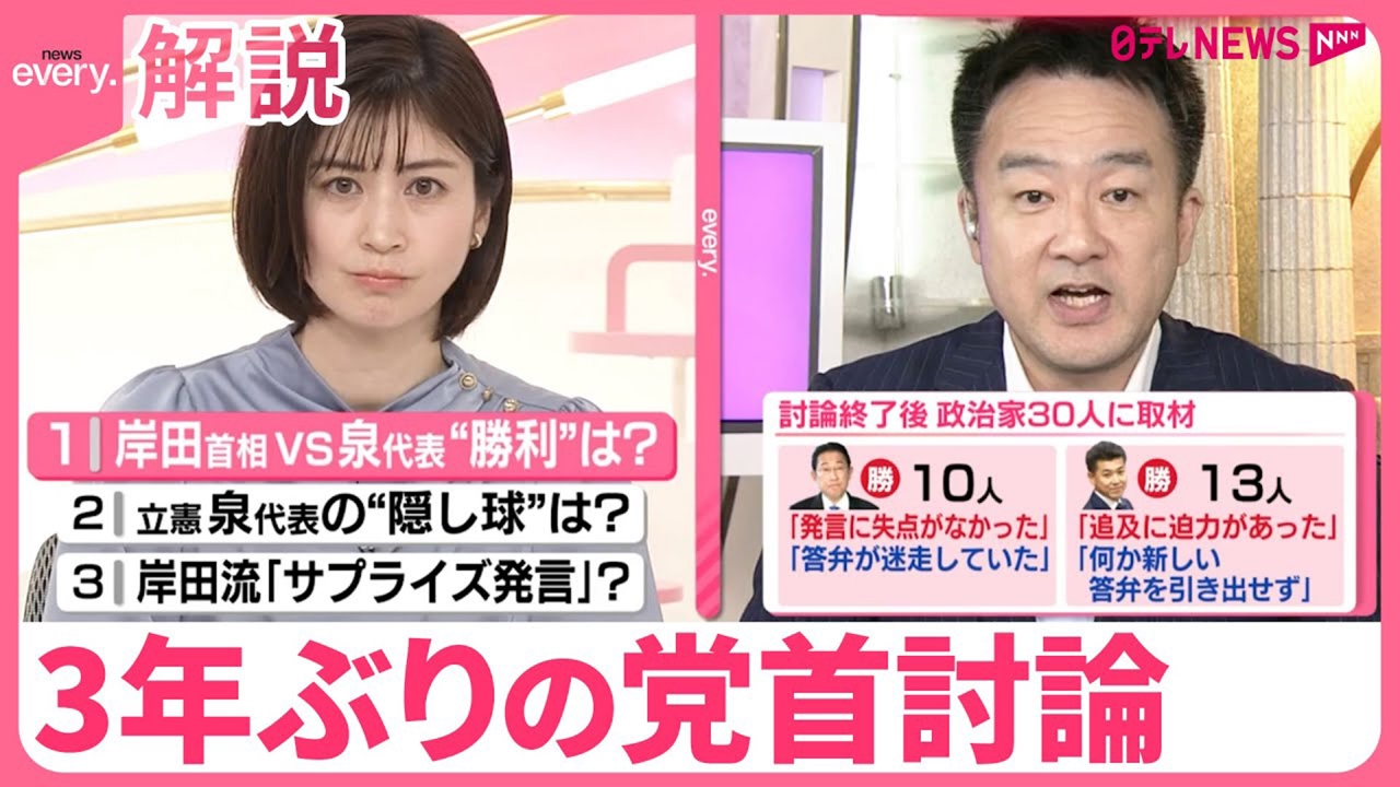 19日、国会では約3年ぶり、岸田政権になって初めての党首討論が行われました。岸田首相と立憲民主党・泉代表の一騎打ちは、どちらに軍配が上がったのか? 政治部官邸キャップの平本典昭記者が3つのポイント、『岸田首相vs立憲・泉代表 “勝利”は?』『泉代表の“隠し球”は?』『岸田流“サプライズ発言”は?』について解説します。 (2024年6月19日放送「news every.」より)