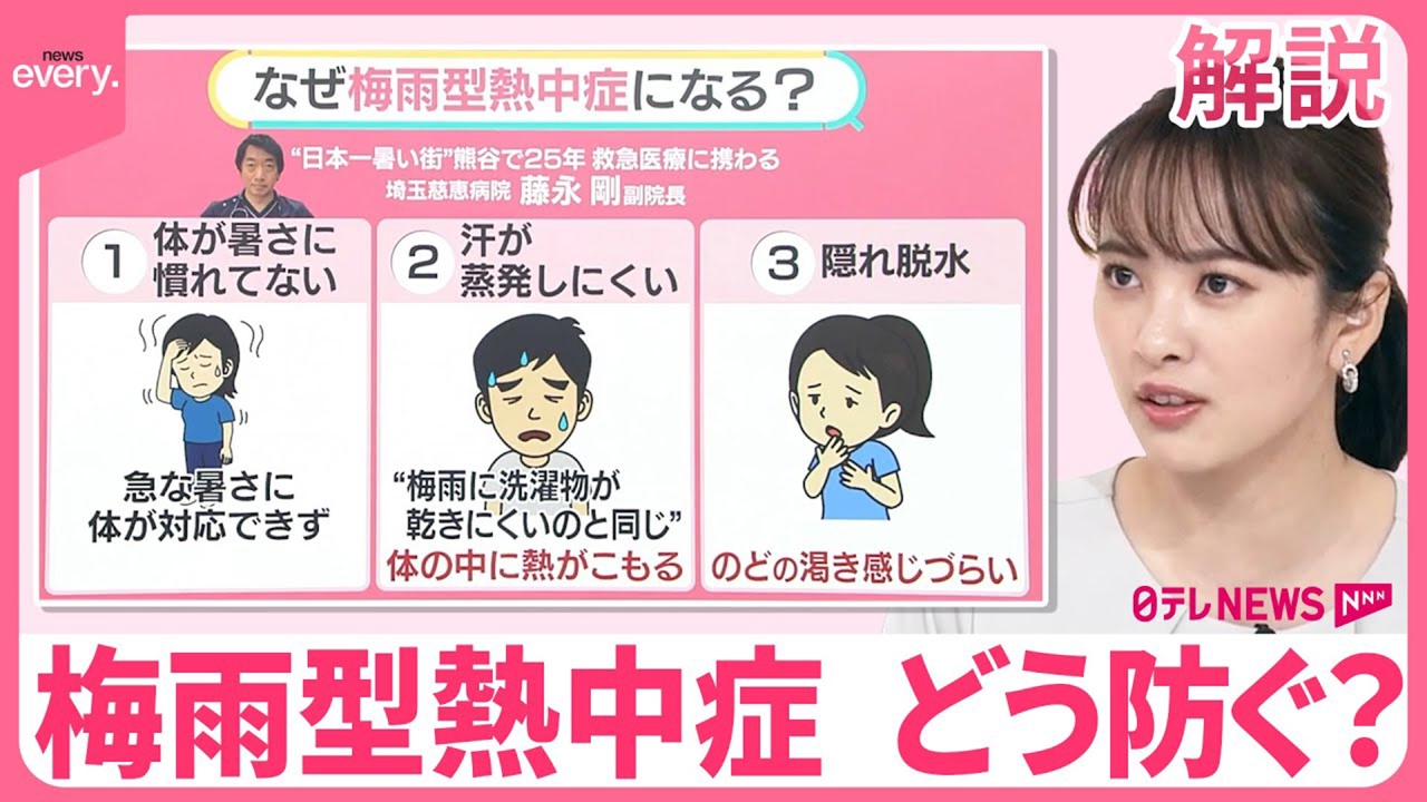 熱中症で搬送される人は去年、6月後半から急増しました。梅雨時期特有の「梅雨型熱中症」への対策は今から必要で、気温だけでなく湿度にも注意する必要があります。梅雨型熱中症を引き起こす1つが「隠れ脱水」。症状やチェック方法、対策を紹介します。 (2024年6月25日放送「news every.」より)