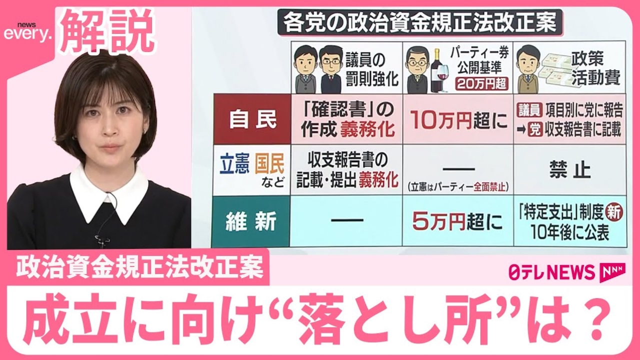 自民党の裏金事件を受け、衆議院の特別委員会では各党が提出した「政治資金規正法」改正案の審議が22日にスタートしました。野党側は自民党案を厳しく批判しています。政治部官邸キャップ・平本典昭記者が解説します。(2024年5月22日放送「news every.」より)