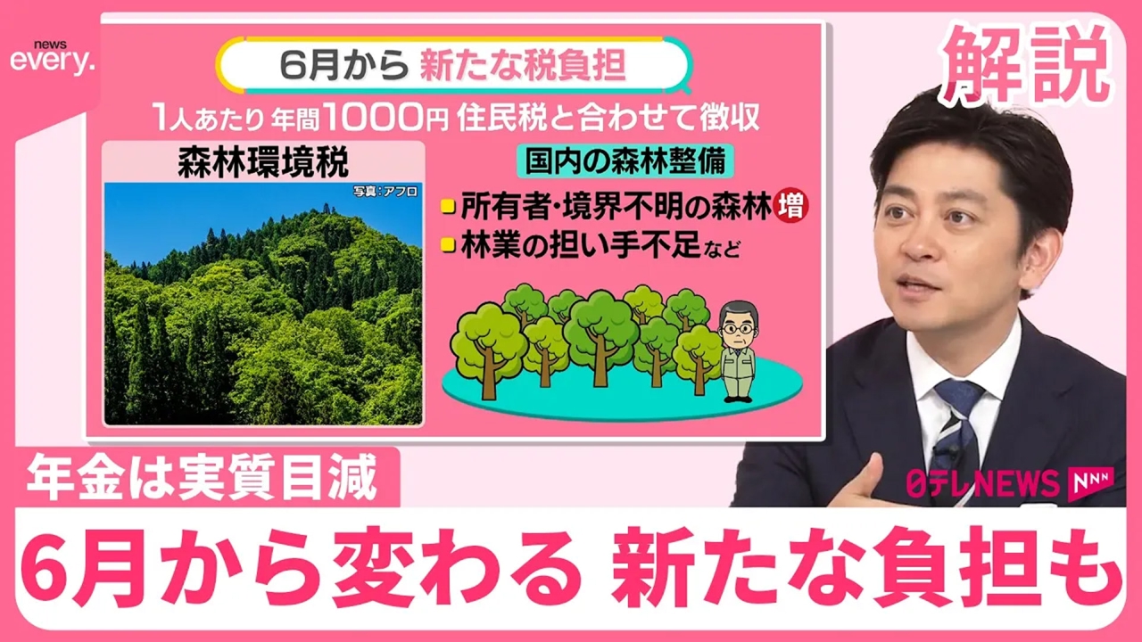 定額減税が始まり、病院の診察料や電気料金といった負担が増えるなど、6月からはさまざまな変化があります。その1つが年金で、支給額は昨年度より増えますが、手放しで喜べるわけではなさそうです。「森林環境税」として1人1000円の徴収も始まります。 (2024年5月31日放送「news every.」より)
