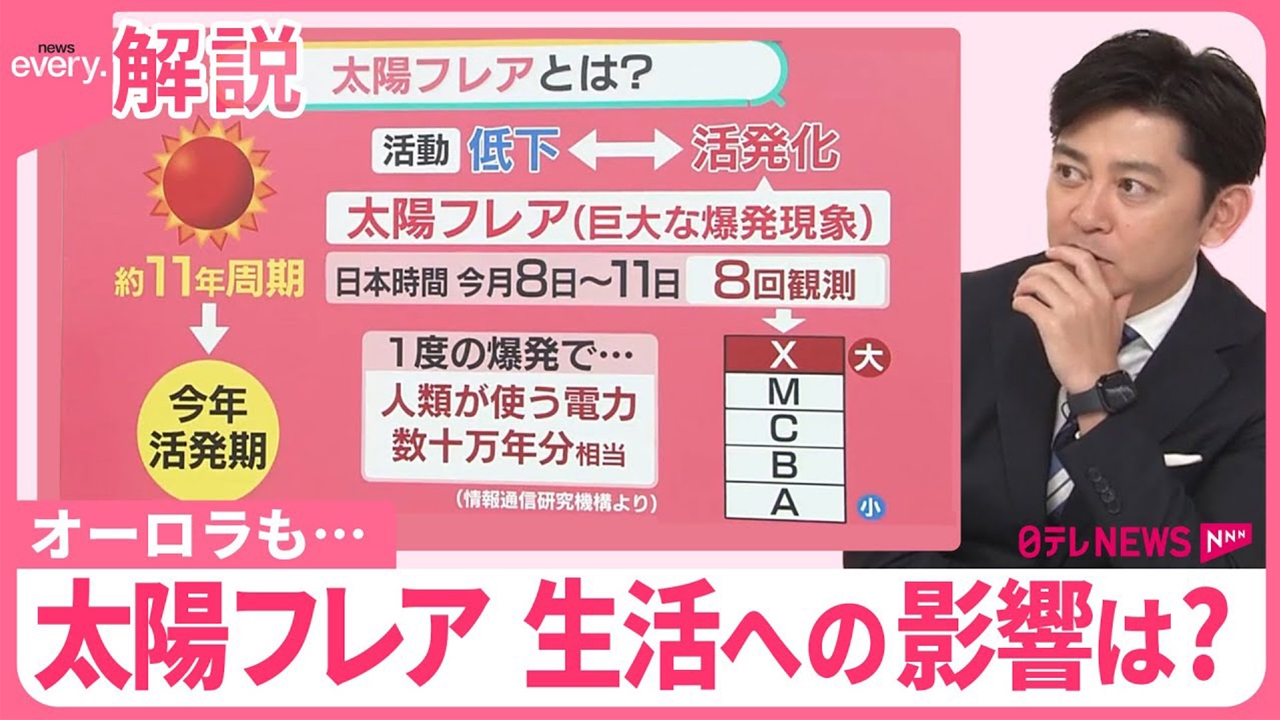 各地で鮮やかなオーロラが観測され、話題になりました。約11年周期の爆発「太陽フレア」で磁気を帯びた風が地球に届き、磁場が乱れたことによる現象です。GPSや無線、電力などさまざまな分野への影響が心配されましたが、実際はどうだったのでしょうか。(2024年5月13日放送「news every.」より)