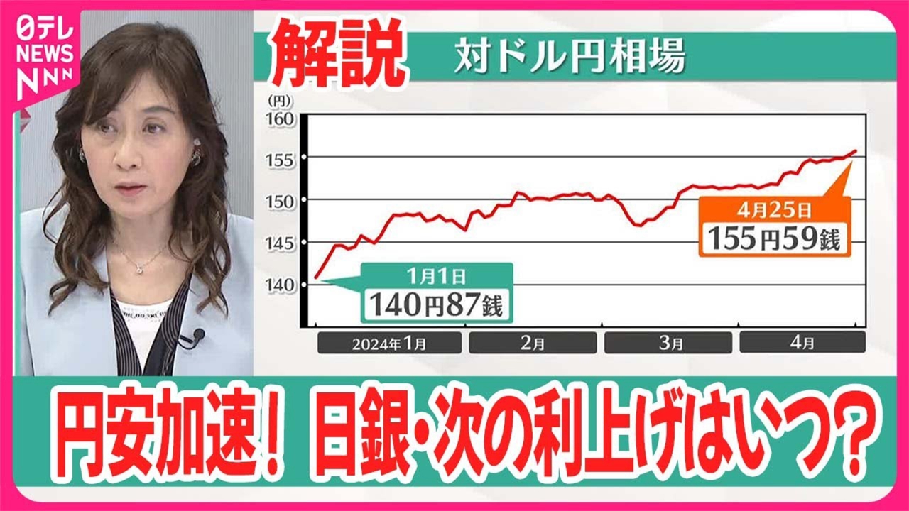 日銀は金融政策決定会合で、金融政策の維持を決定。それを受け、円相場は1ドル156円台にまで下落、約34年ぶりの円安ドル高水準を更新した。 (2024年4月26日放送)