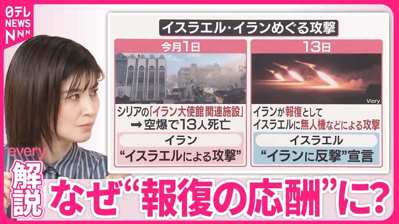 日本時間14日の朝、イランがイスラエルに向けて300以上の無人機とミサイルによる攻撃を行いました。4月1日にシリアにあるイラン大使館の関連施設が空爆されたことへの報復とみられています。 (2024年4月15日放送「news every.」より)